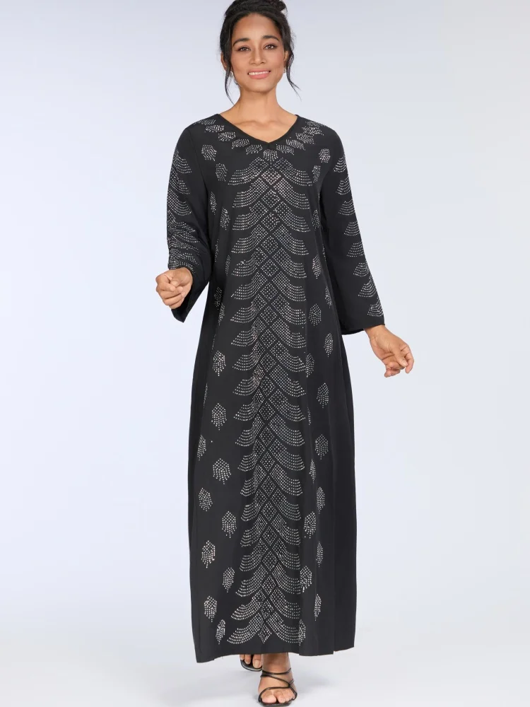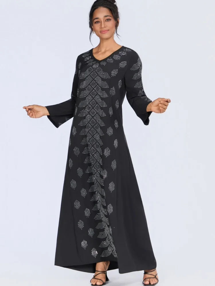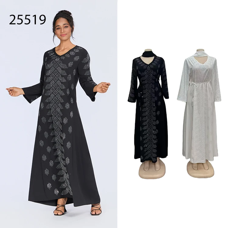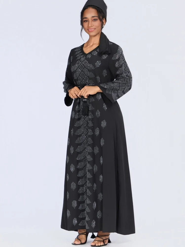 New Wholesale Middle Eastern Muslim Large Size Robe Bright Diamond Long Sleeve V-neck Dress